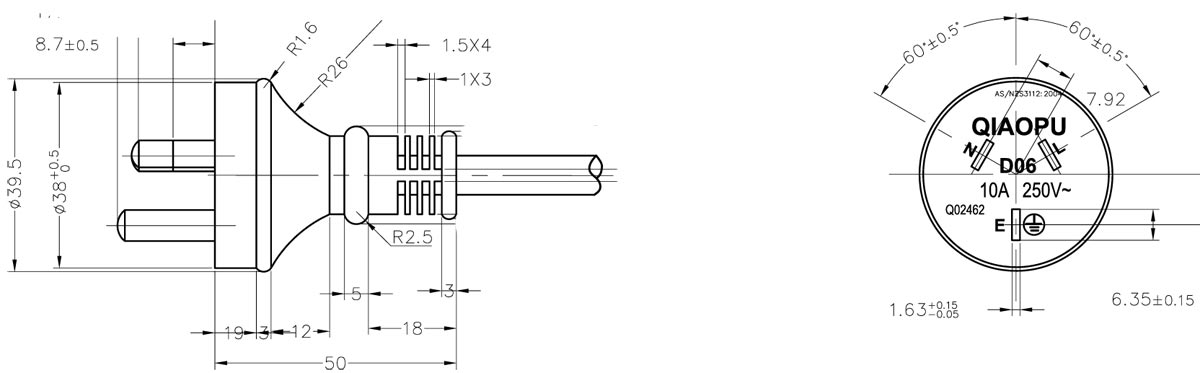 AS 3112 Australia three prong power cord AS/NZ 3112 Australia 3 prong plug power cord with SAA certification Rated up to 10A 250V Built to AS NZ 3112 standards,designed for 3 conductor grounded Australian power supply cord applications, With IEC C5 , With IEC C13 , With IEC C15 , With IEC C19 describe AS plug molded with IEC 60320 international connectors,All of our Australia SAA AC power cords products are fully made with ergonomic design and RoHS / REACH compliant。