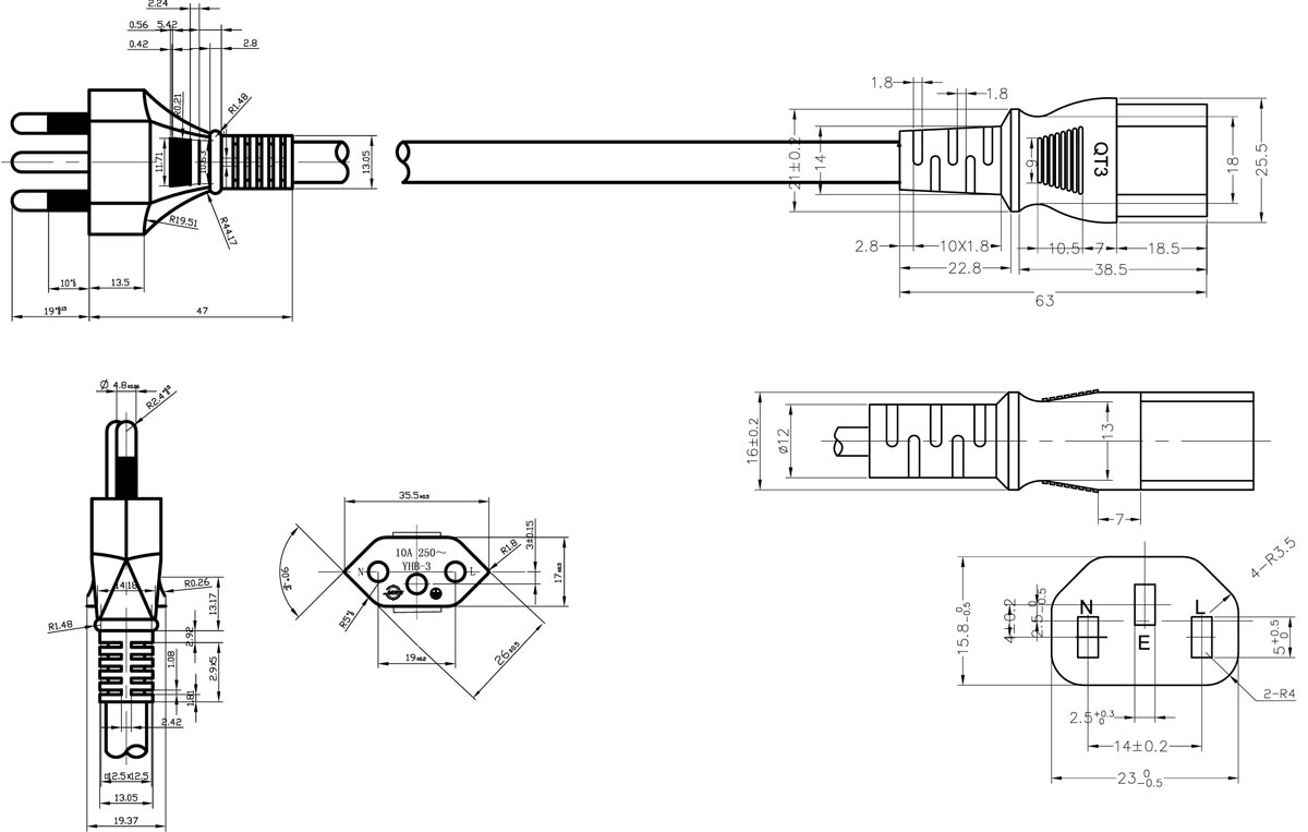 Brazil Power Cords UC INMETRO Plug end IEC C13 Drawing (RoHS COMPLIANT)